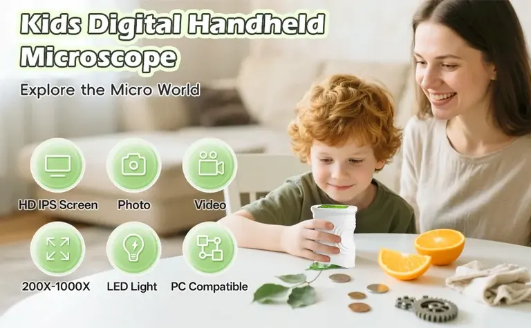 A portable handheld digital microscope designed for children, collectors and hobbyists, with a 4K imaging sensor, built-in 2.0-inch LCD screen and rechargeable battery for learning anywhere.